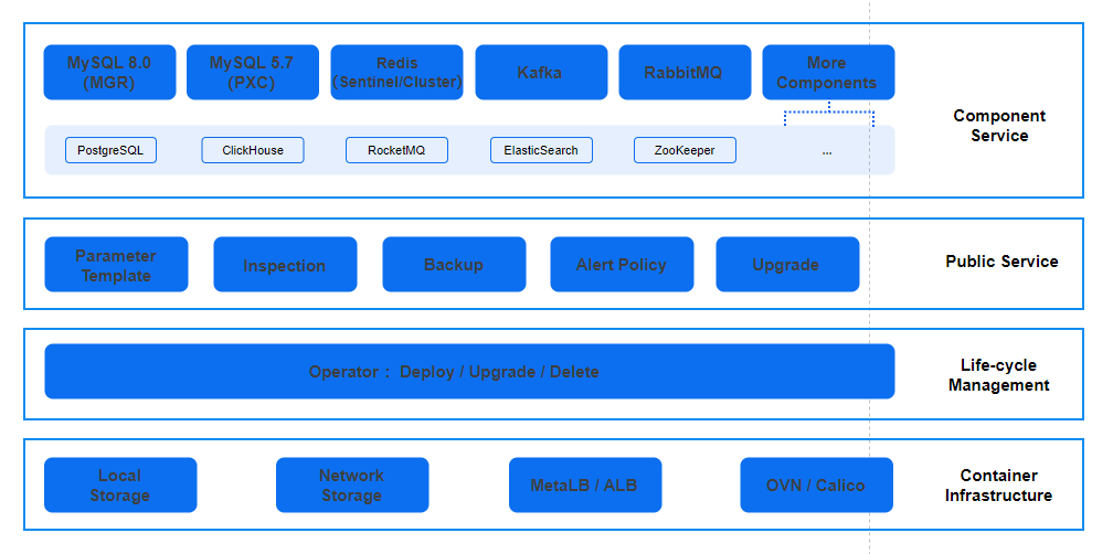 • Container Infrastructure: The Alauda Application Services platform is built on Kubernetes and leverages the underlying infrastructure it provides to offer foundational capabilities such as data persistence and external access.