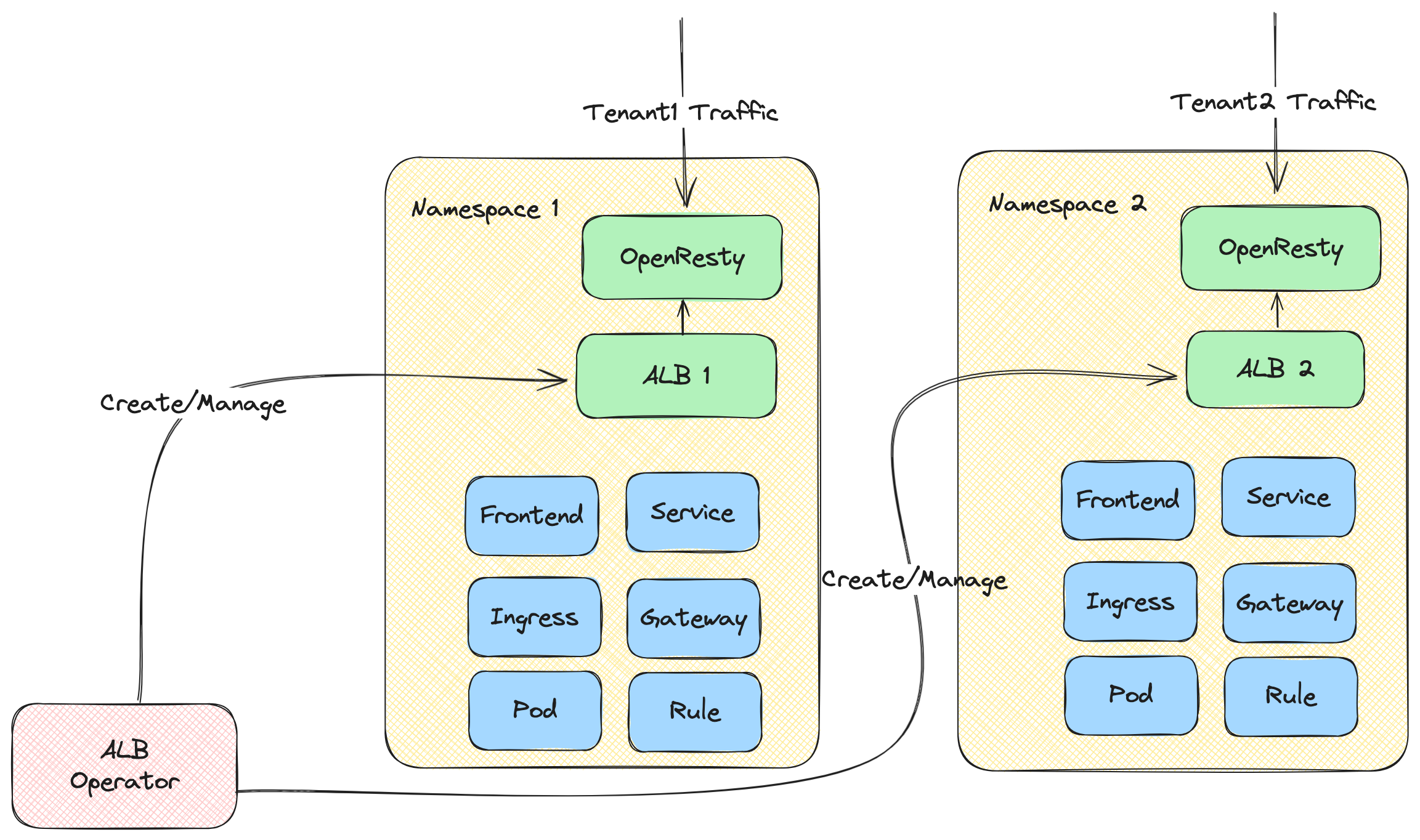 ALB-Operator, a default component deployed in the cluster, is an operator for ALB. It will create/update/delete Deployment and other related resources for each ALB according to the ALB resource.
