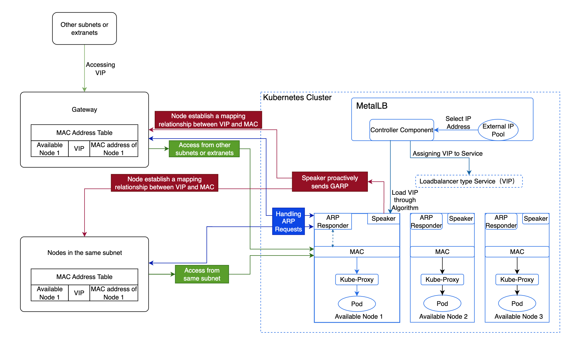 • When this node encounters a failure, MetalLB selects another leader to host the VIP. Then send GARP to refresh Service IP mac address, thereby ensuring high availability.